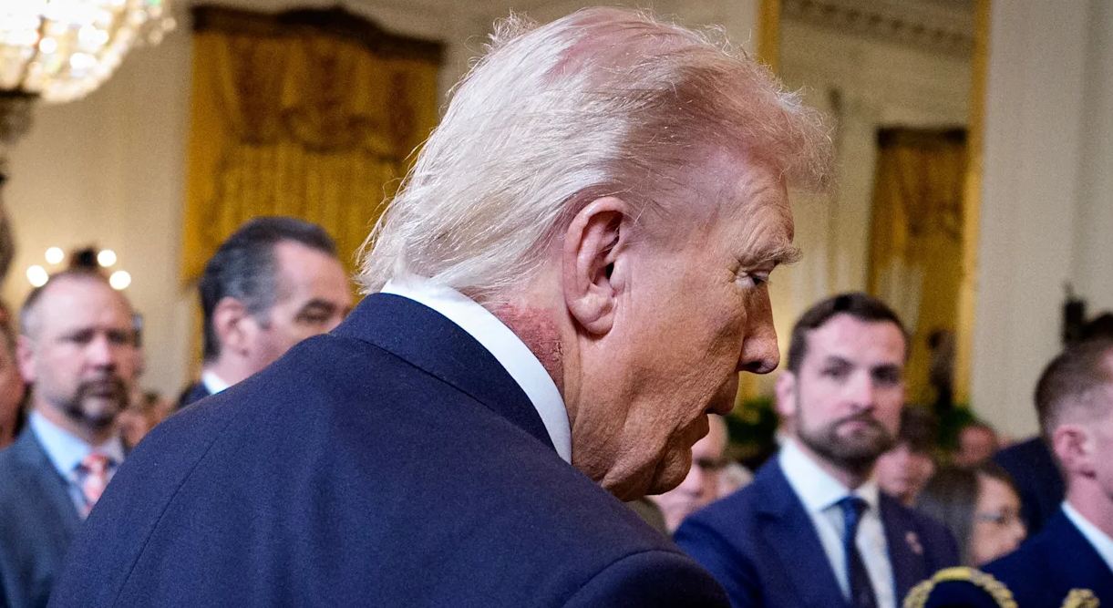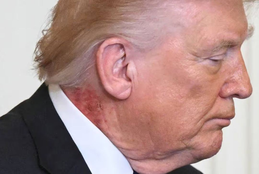President Trump drew widespread attention during a Medal of Honor ceremony at the White House on March 2, 2026, when photographs showed a large red rash and possible scabbing on the right side of his neck, extending from just behind his ear toward his hairline. Other visible marks, such as bruising on his hand, also raised questions among observers.