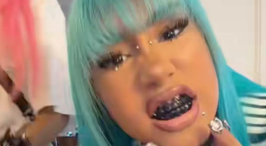In the TikTok clips, North West wore what looked like a bridge piercing — a bar piercing across the upper part of the nose between the eyes. While it is unclear if the piercing is real or a temporary, fashion-forward accessory, it nonetheless added an edgy element to her look. Complementing this were her bright blue bangs and striking black grills on her teeth, giving off a rebellious vibe. Adding to the dramatic style, North also sported a 106-carat diamond skull necklace, reportedly gifted by her mother Kim Kardashian. The extravagant jewelry further emphasized the boldness of her new aesthetic. This combination of dramatic hair, facial adornments, and high-end accessories showed North confidently experimenting with her personal style in ways that have rarely been seen from someone her age.