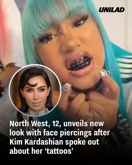 Twelve-year-old North West, daughter of Kim Kardashian and Kanye West, recently made headlines after unveiling a striking new appearance on social media. In a series of TikTok videos posted early January, North showcased what appeared to be new face piercings along with vibrant blue hair, blackened dental grills, and bold jewelry. The unexpected transformation quickly sparked widespread conversation, ranging from praise for her creativity to concern over her young age and public image.